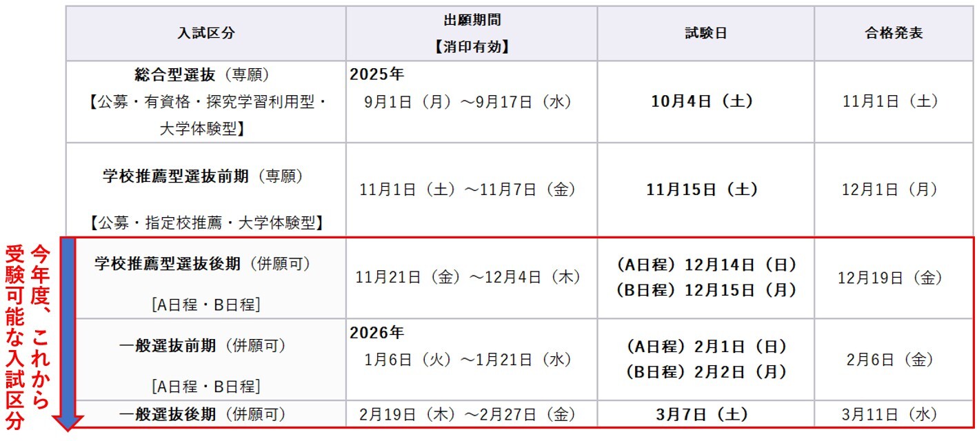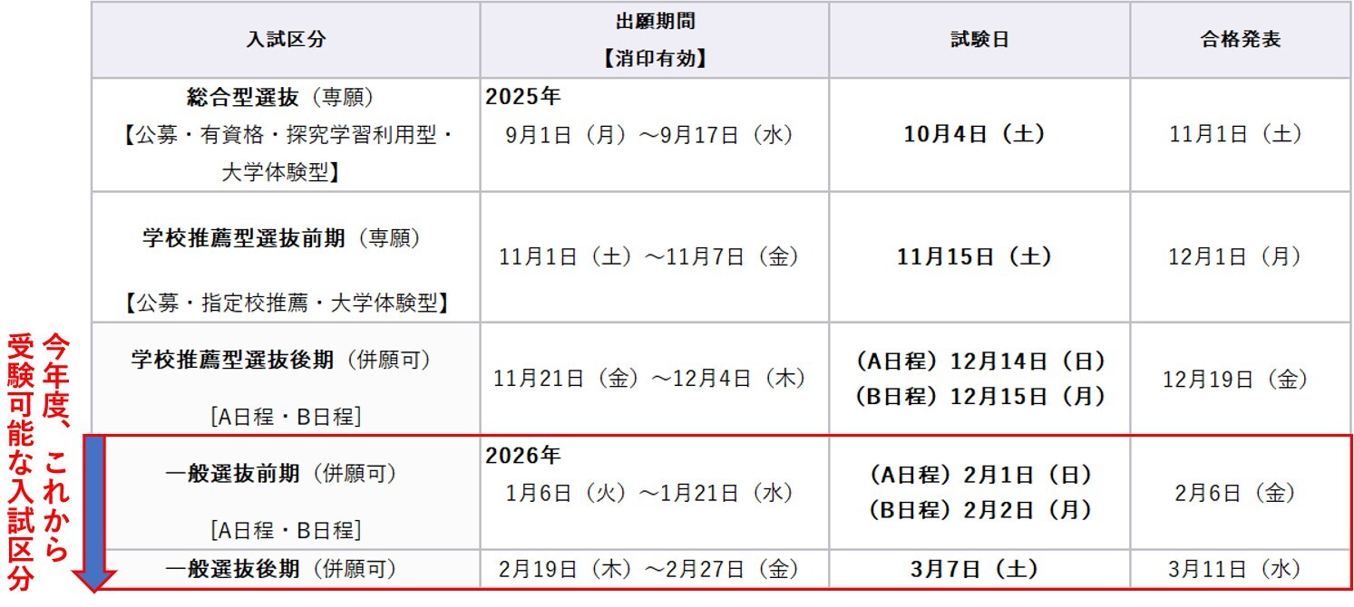 また、一般選抜後期への出願期間は2026年2月19日(木)~2月27日(金)です。